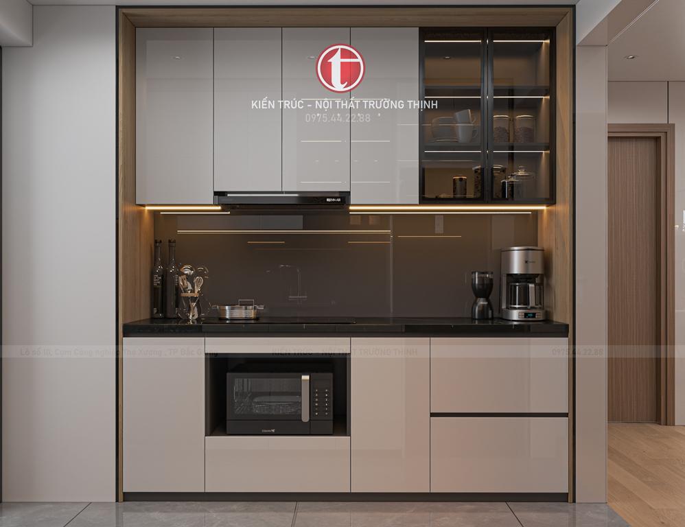 tủ bếp hiện đại với nhiều ngăn lưu trữ, giúp việc nấu nướng trở nên thuận tiện và khoa học. Tông màu trung tính kết hợp mặt bếp tối màu tạo sự hài hòa và sạch sẽ.