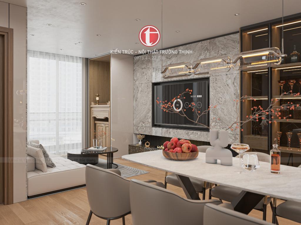 Chung cư Diamond Hill – Tháp đôi Bách Việt được Nội thất Trường Thịnh thiết kế theo phong cách hiện đại, tinh tế và hướng tới trải nghiệm sống lâu dài của gia đình. Không chỉ chú trọng đến vẻ đẹp thẩm mỹ, toàn bộ không gian còn được bố trí hợp lý để đảm bảo sự tiện nghi, thoải mái và phù hợp với sinh hoạt hàng ngày.
