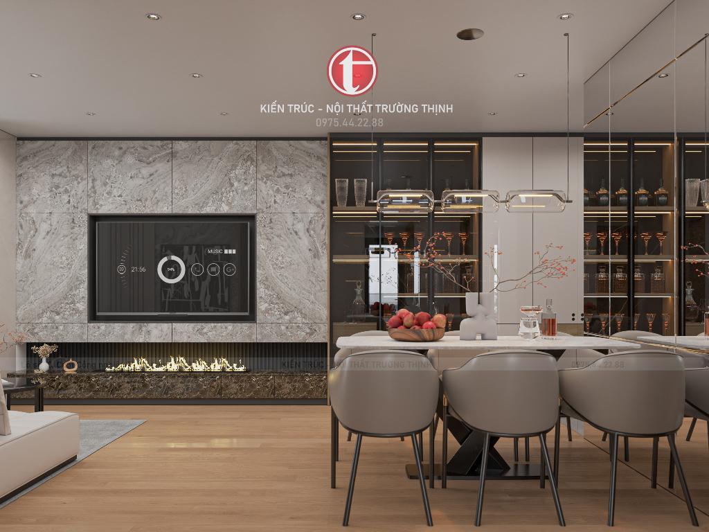 Mảng tường tivi được xử lý bằng vật liệu trang trí kết hợp hệ tủ trưng bày và ánh sáng led, tạo điểm nhấn cho toàn bộ không gian. Thiết kế mở giữa phòng khách và khu vực bàn ăn cũng giúp căn hộ trở nên rộng rãi và kết nối hơn.