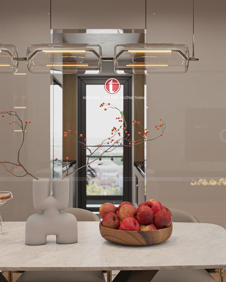 Bàn ăn được đặt ngay cạnh khu vực bếp, kết hợp hệ đèn trang trí phía trên giúp không gian thêm phần ấm cúng. Đây là nơi cả gia đình có thể quây quần bên nhau trong những bữa cơm hàng ngày.