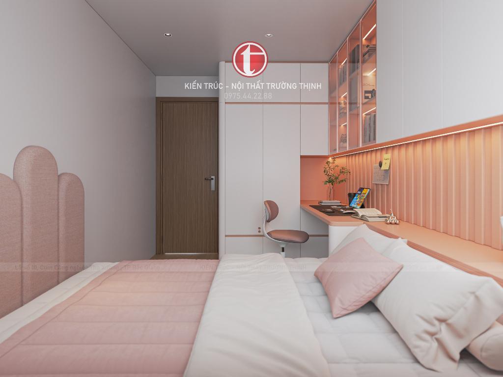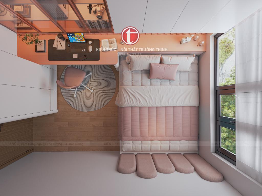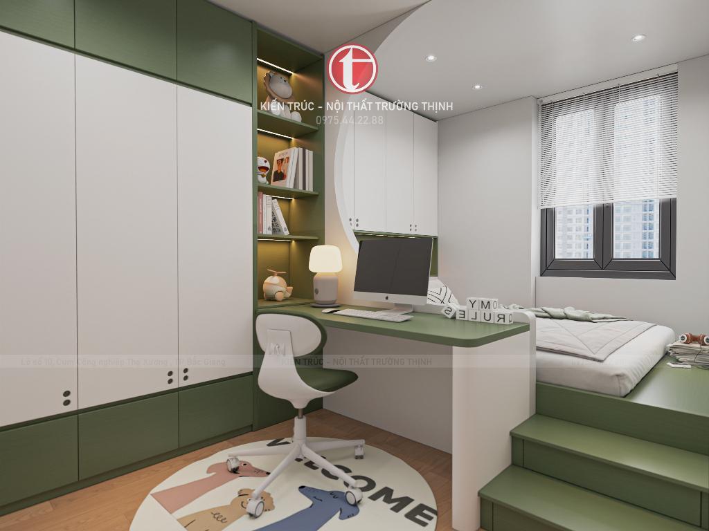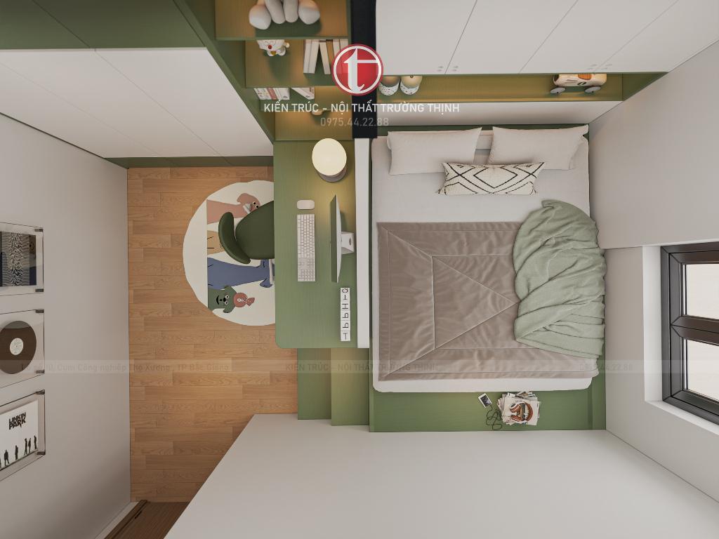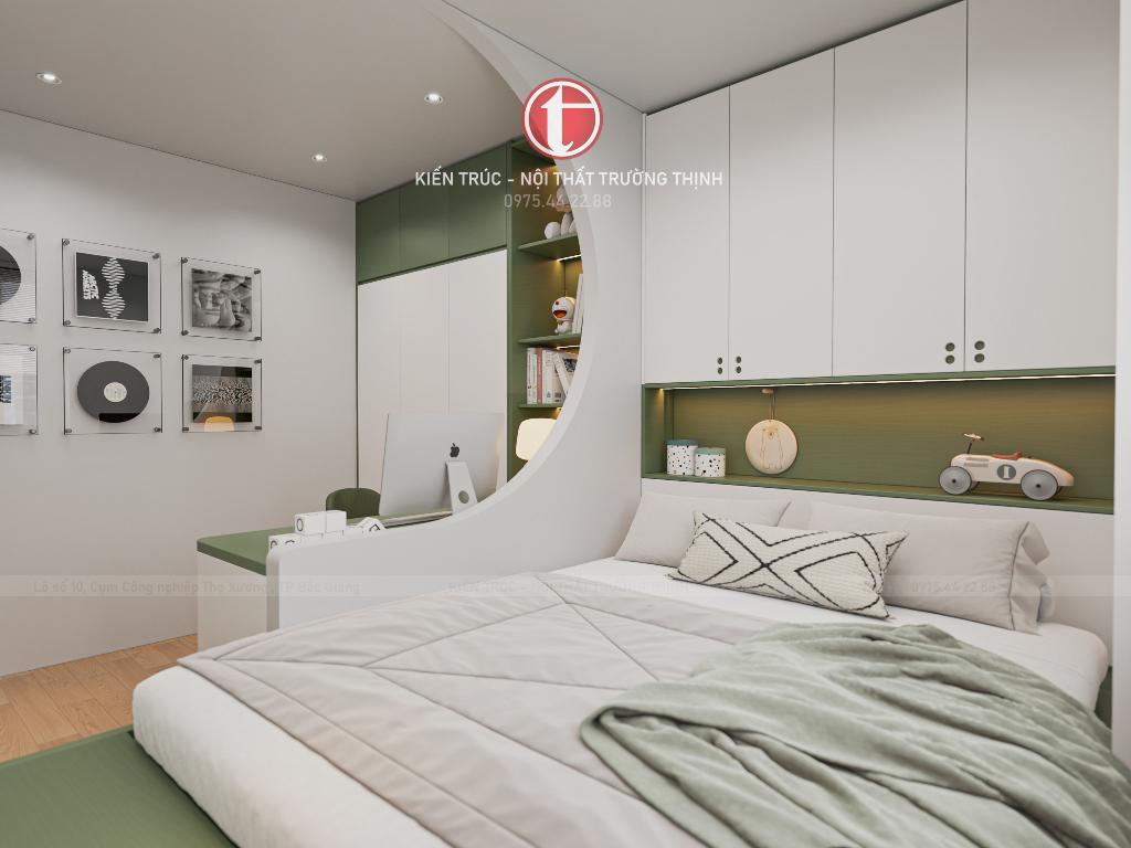 Phòng ngủ trẻ em được bố trí linh hoạt với giường ngủ, bàn học và hệ tủ lưu trữ, tạo nên không gian sinh hoạt và học tập tiện nghi cho trẻ. Trong khi đó, phòng ngủ phụ được thiết kế đơn giản nhưng vẫn đầy đủ công năng, phù hợp làm phòng cho khách hoặc người thân.