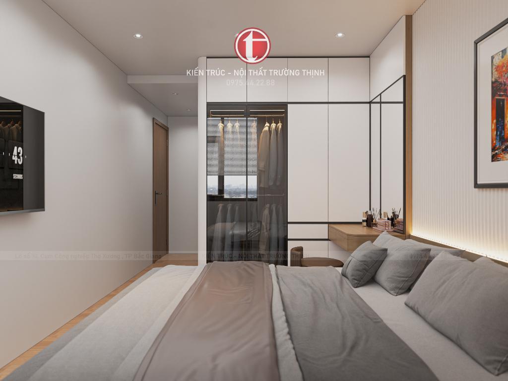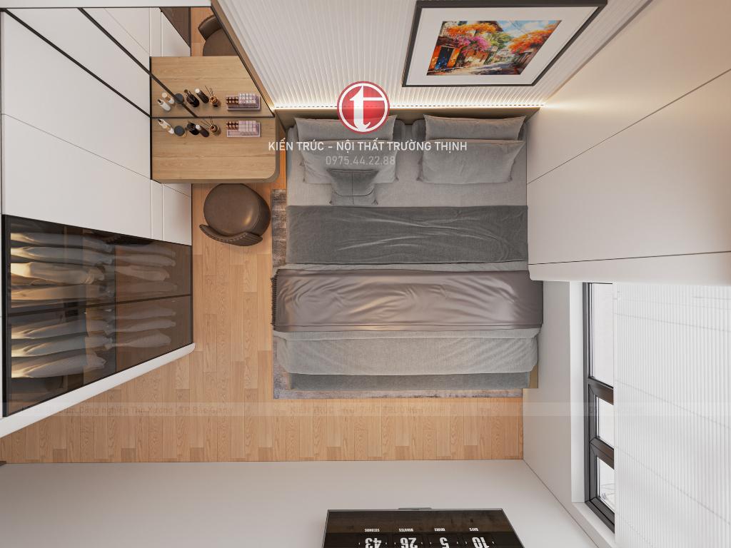Phòng ngủ master được thiết kế với phong cách nhẹ nhàng, tập trung vào sự thư giãn. Hệ tủ quần áo âm tường giúp tiết kiệm diện tích và giữ cho không gian luôn gọn gàng.